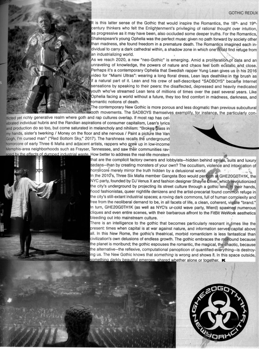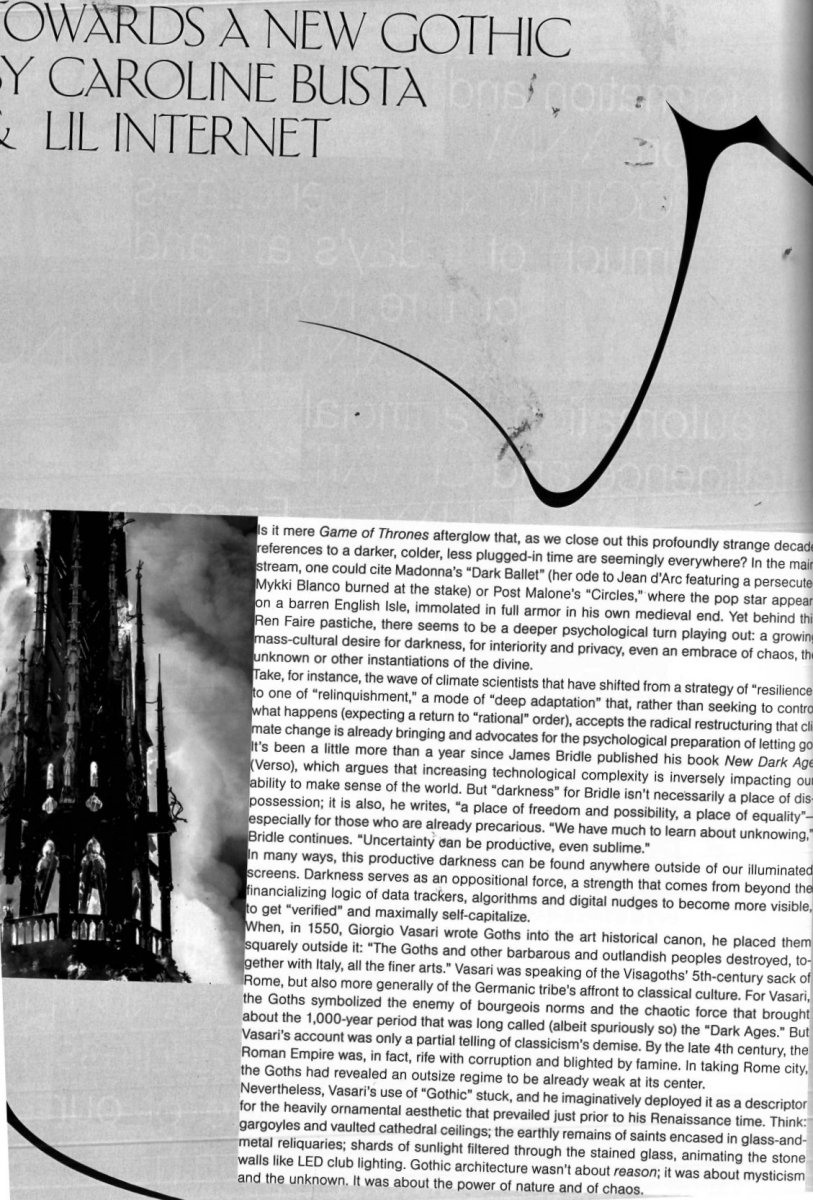 Reading about this article in Kaleidoskope Magazine was very interesting as it was an intrduction to the section which contained the interview with Anne Imhof and Eliza Douglas and it has offered me a greater contextual awareness for the development of my project and possibly a better understanding of the cultural issues and debates my work is typically interesested in. I found it very inspiring how the article reflected the influence of the bleak times that we are living in both high art and popular culture. I am especially attracted to the way it draws parallels to the Middle Ages and gothic art and architecture in particular and how they address uncertainty and fear through mystcism, as this is particularly relevant to my project. It also provided me with some other reference points to research, for example the book "New Dark Ages" by James Bridle. Overall, I think the article really helped me have a better understanding of how in an age of uncertainty and obscurantism, a sense of lack of knowledge and, therefore, fear, can develop a taste for darker aesthetics and concerns.