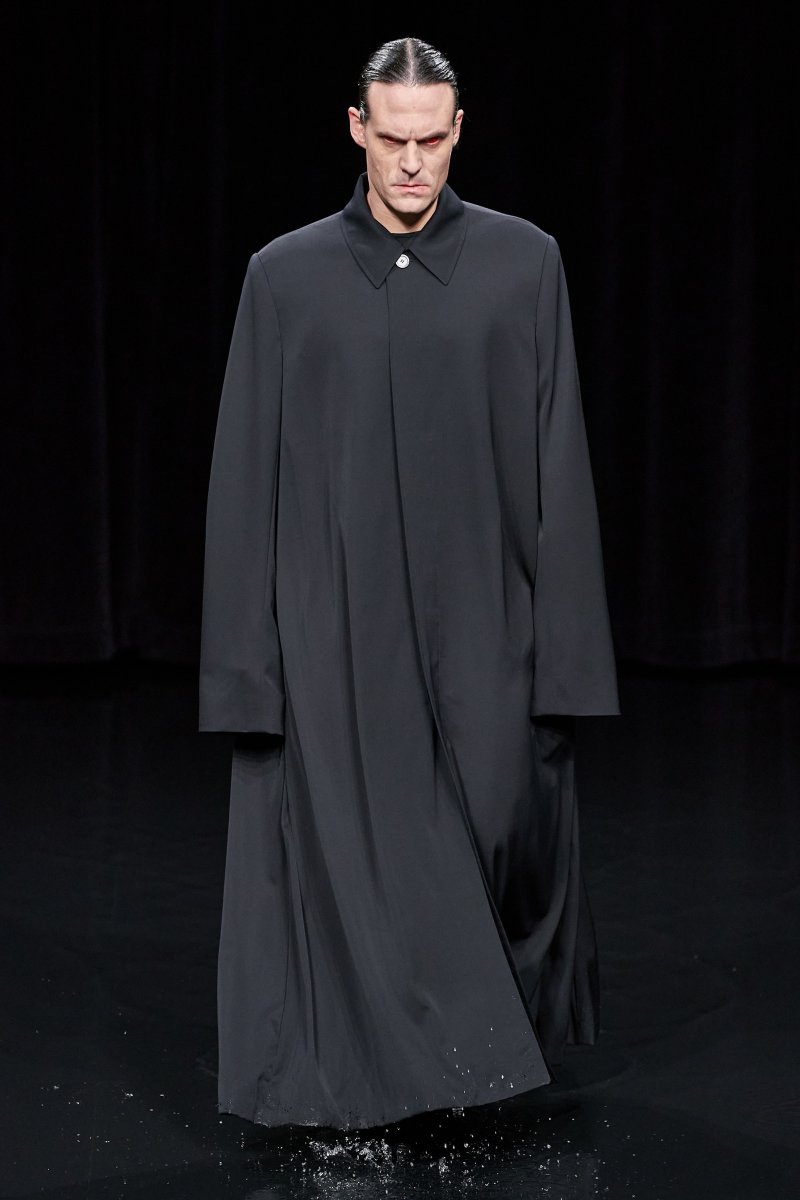 Neo-gothic dressing looks back and forward at the possibilities of menswear, layering floor-length skirts and caped coats. Bodybuilder “made-to-measure” fits create oversized, anabolic suits for anyone. Sport, religion, obsession, and seduction are stripped of their functions, leaving only the sensation of a fashion object: extravagant, dramatic, erotic, or menacing.