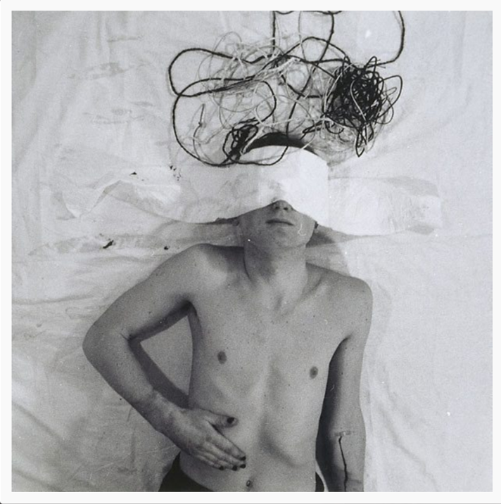 "He is best known today for photographs depicting his series of closely controlled "Aktionen" featuring such iconography as a dead fish, a dead chicken, bare light bulbs, colored liquids, bound objects, and a man wrapped in gauze. The enduring themes of Schwarzkogler's works involved experience of pain and mutilation, often in an incongruous clinical context, such as 3rd Aktion (1965) in which a patient's head swathed in bandages is being pierced by what appears to be a corkscrew, producing a bloodstain under the bandages. They reflect a message of despair at the disappointments and hurtfulness of the world."