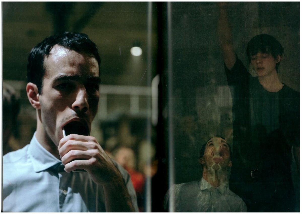 ED The installation and the sculptures in these shows often influence the performative elements taking place within. Some of the people we work with are trained dancers, but I’m not one of those, so I rely a lot on working with stuff in the space. That’s the case with the glass in Faust, and also props, which were part of the installation and could be used by performers. They determined very much what kind of images were made. An obvious one would be vaping in Sex. In Angst (2016), there were seeds that we could spit, or markers or spray paint that would be available to the performers to use within the performance.