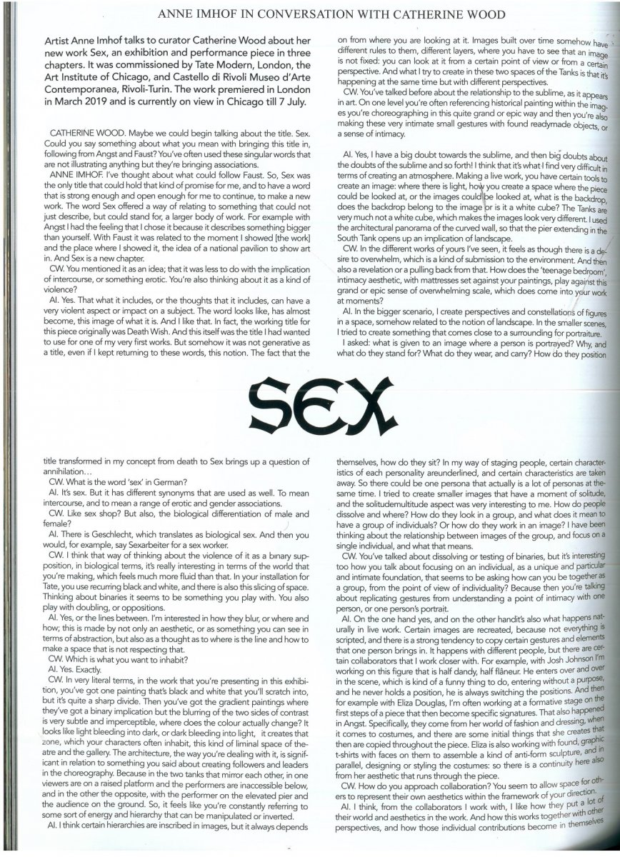 In Sex, I contrasted the vast space of Tate Modern’s Tanks, which had allowed performers to create huge pits in the audience, with the intimacy of the images created by people hanging out on high beds and mattresses under the paintings in the galleries. The aspect of dreaming as a form of resistance or imaginary action was very important to me. I just opened a show in Berlin with the title “Imagine” where this also stood central.