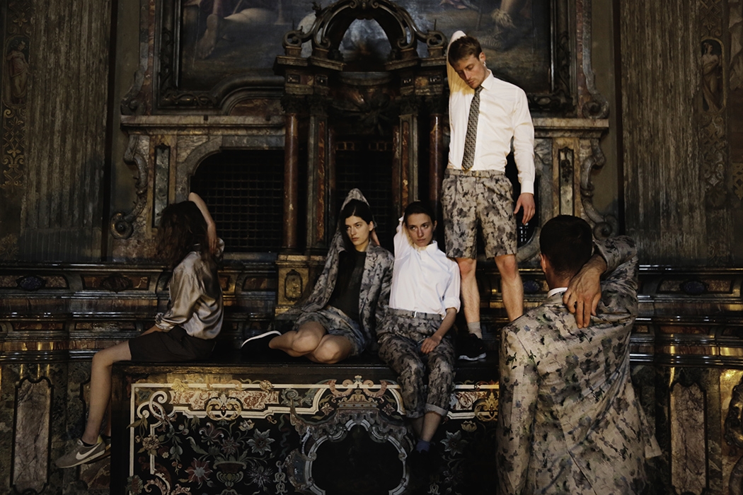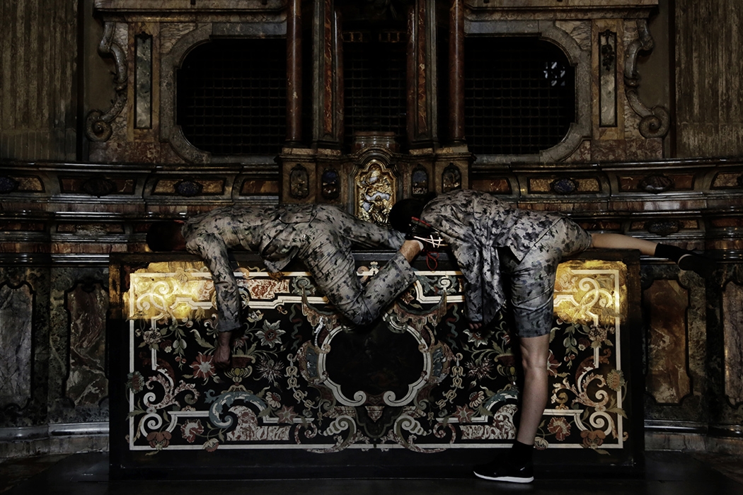 AI It always comes from the idea of composition or perspective, allowing the viewer to navigate the space while engineering moments of inaccessibility for the performance to create a very distinct viewpoint towards an image. In Faust, I wanted to work with industrially fabricated glass. I was walking through Frankfurt, with its large skyscrapers, banks. I noticed how glass separates you physically but not visually: its materiality is transparent while being reflective. I liked the simple fact of it being the window to something. In the German pavilion, there was the horizontal glass of the floor, and then there were vertical plates that parted the apse in the back of the main space. I was interested in how the glass reflected you as the viewer, while also allowing you to see what’s behind it and creating some sort of depth, all while serving as a framing device for the images that the performers created. The glass simultaneously reflected the viewers and the space in front of the surface, allowing me to create images that were partly mirrored on top of each other , almost like a thin layer of oil or a double exposure.