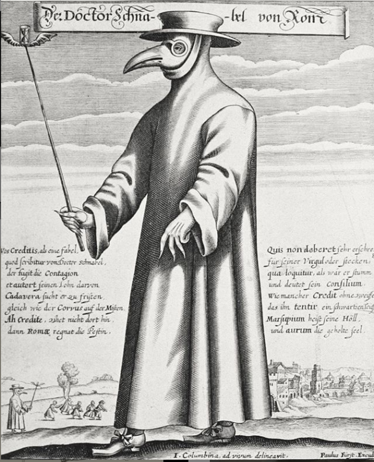 "Der Doctor Schnabel von Rom", engraving by Paul Fürst, 1656. The depiction was actually satyrical: Schnabel means more or less "beaky": the author was making fun of plague doctors working in Rome. According to the "miasma" theory (from a Greek word which means "contamination"), certain diseases (such as cholera, black plague, yellow fever) stemmed from a direct contact with certain poisonous vapors - an effect of putrefaction of the matter, swamps, corpses, or pollution. That is why, back in the 17th century, doctors used to wear masks with two lower holes, filled with spices, vinegar, herbs and roses, in order to protect themselves from the "poisonous" air. They did not know about virus or bacteria, but grasped the fact that something was wrong with the air. The stick was not a magic wand. It has in fact multiple uses: warding off rats, giving directions to people actually touching the diseased, or lifting the patient's linens. Such sticks usually had hands, not wings - in this peculiar case, it works as a metaphore for death: "time flies", to explain that this physician has not arrived to heal people, but to kill them. These costumes also intentionally terrified people: they vehicled the message that a serious sickness had reached one community."